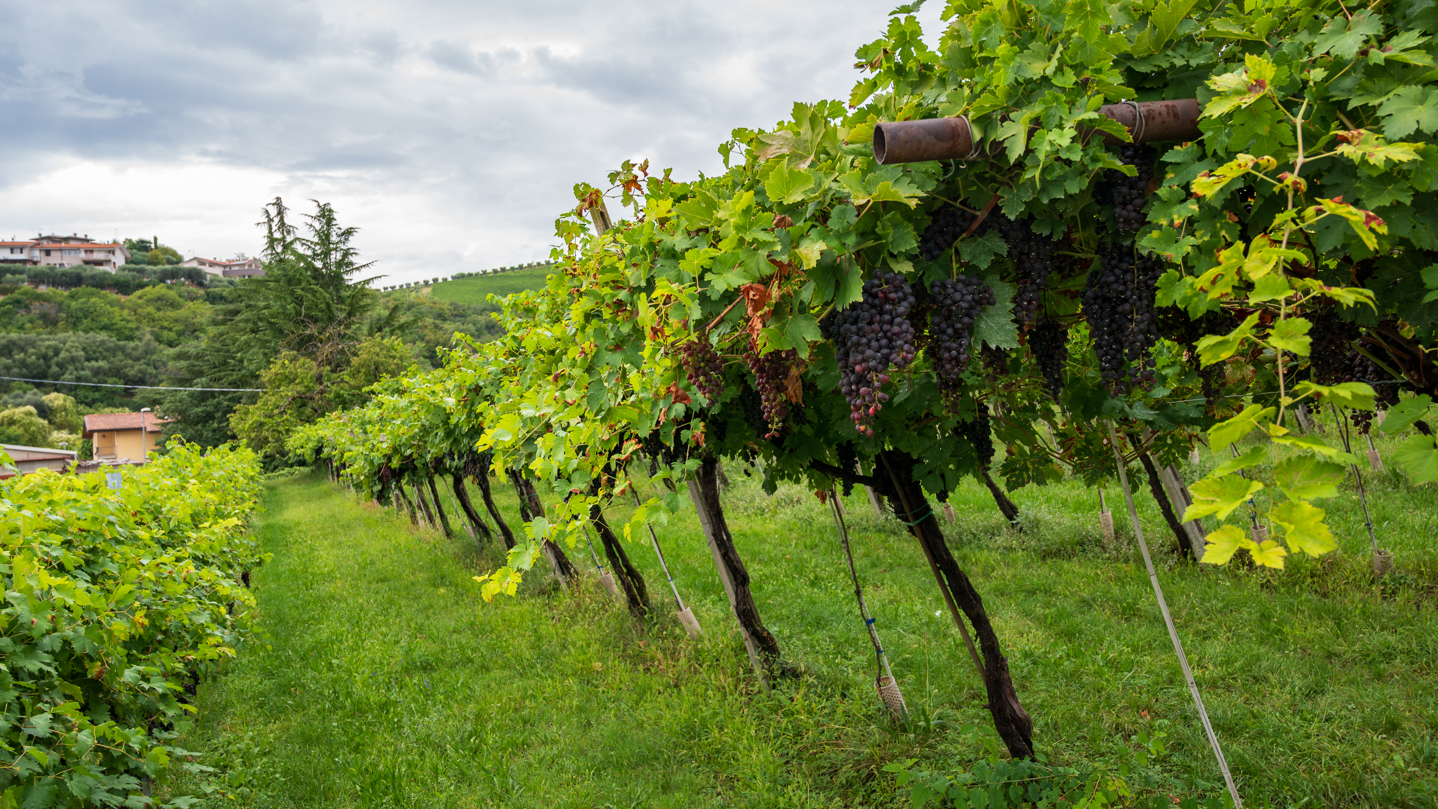 Rader med vinrankor på gården Cantina Meroni. Deras Valpolicella Superiore Classico är magisk,