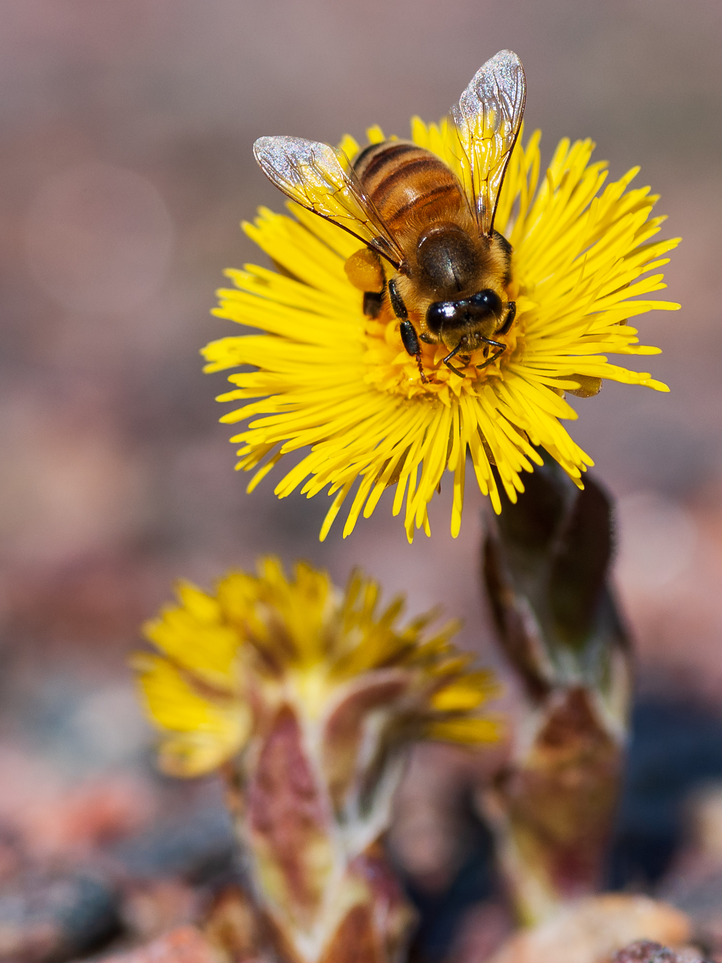 Bi på Tussilago. Foto: Robert Kobsa